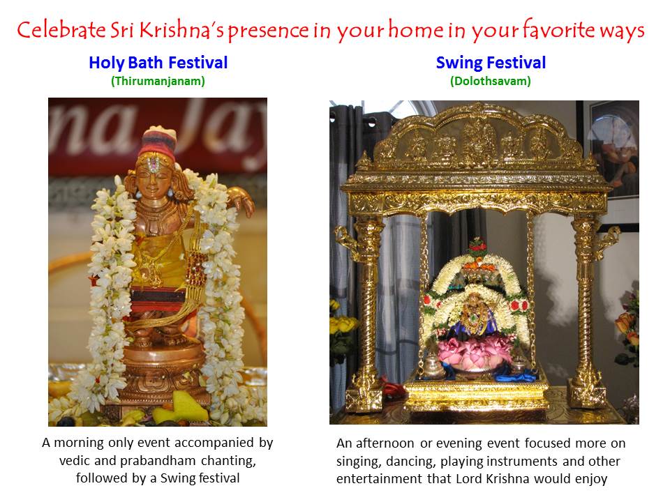 When Krishna arrives at your home be prepared to welcome Him into your home as a honored guest. Play some auspecious music such a Nadaswaram. Have “manjaneer Arathi” (turmeric mixed water) ready with at least two ladies. Optionally, you can have “poorna kumbam” (a silver sombu filled with water with a cocunut as the lid).